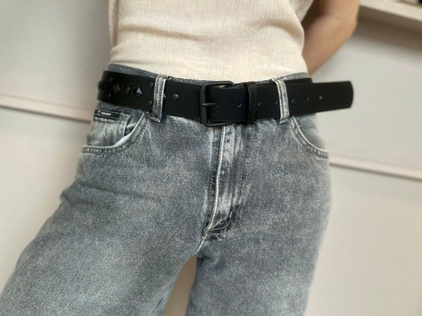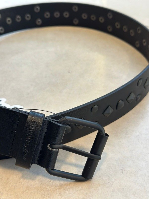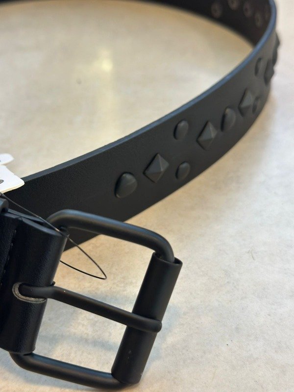 Cinto de eco cuero, con tachas y hebilla negra.